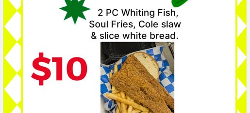 2pc of whiting fish or Pollock fish with fries,Cole slaw and a slice of white bread $10 everyday quick meals